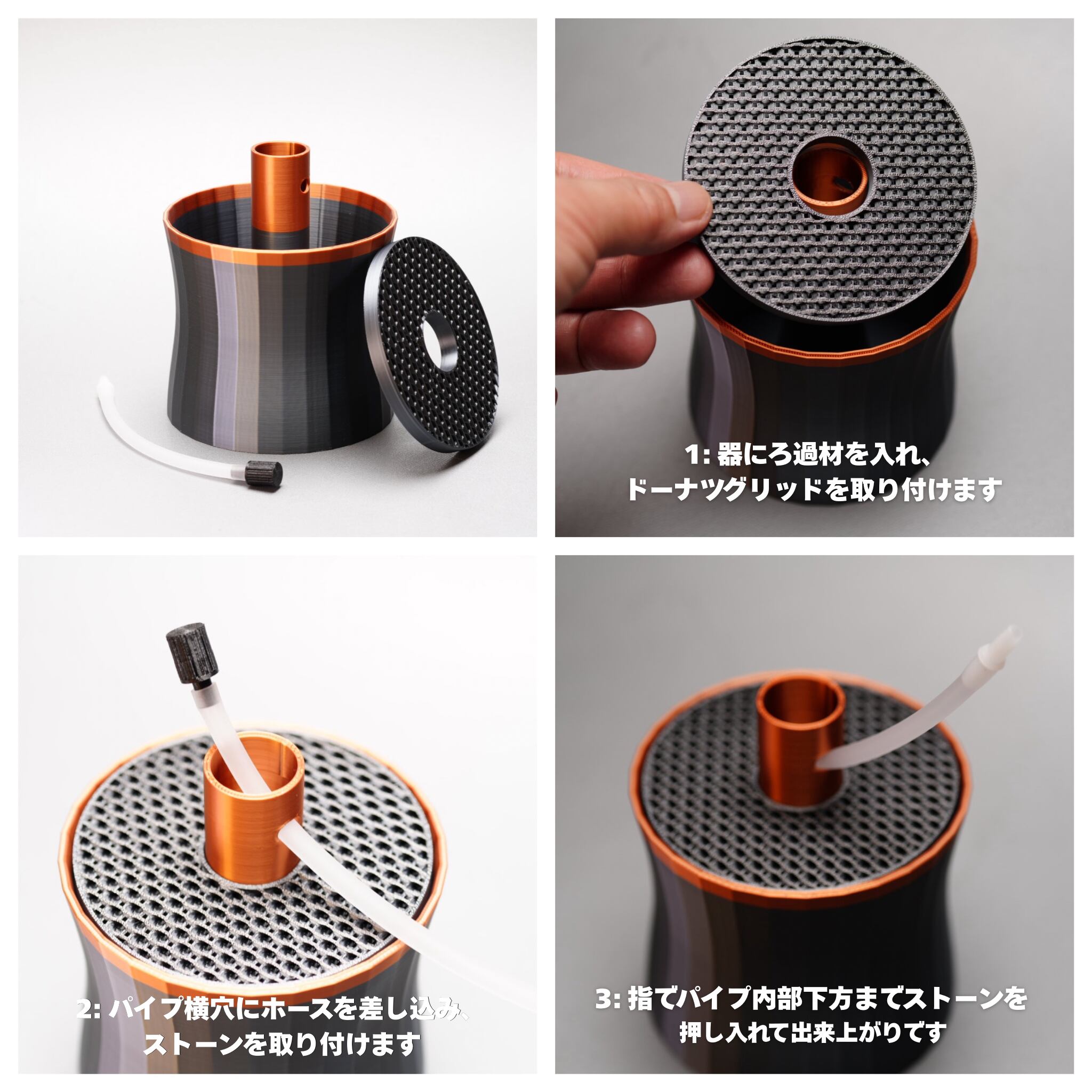 ベストセラーろ過器「SOW」のIT、器、パイプ、小粒ろ過材、大粒ろ過材などの要素をシンプルに再構成した使いやすさ重視のろ過器です